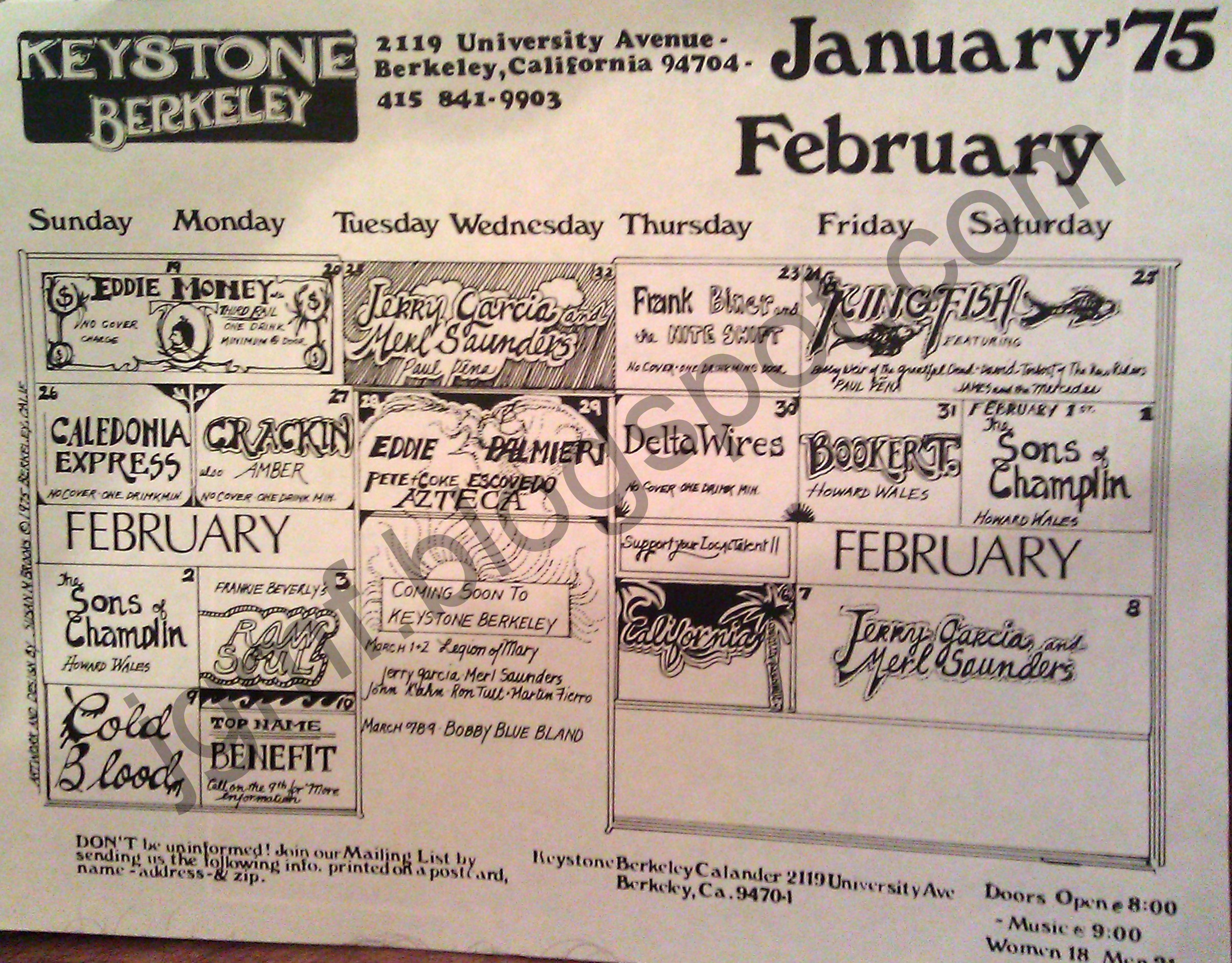 Billings as "Jerry Garcia and Merl Saunders", but consecutive weeks' advertisements from Fred Herrera's clippings (the Fred Files) show a change, with California extended to Feb. 6 and 7 and Butch Whacks listed as tentative for Feb. 8 in the calendar starting with 2/1/75.