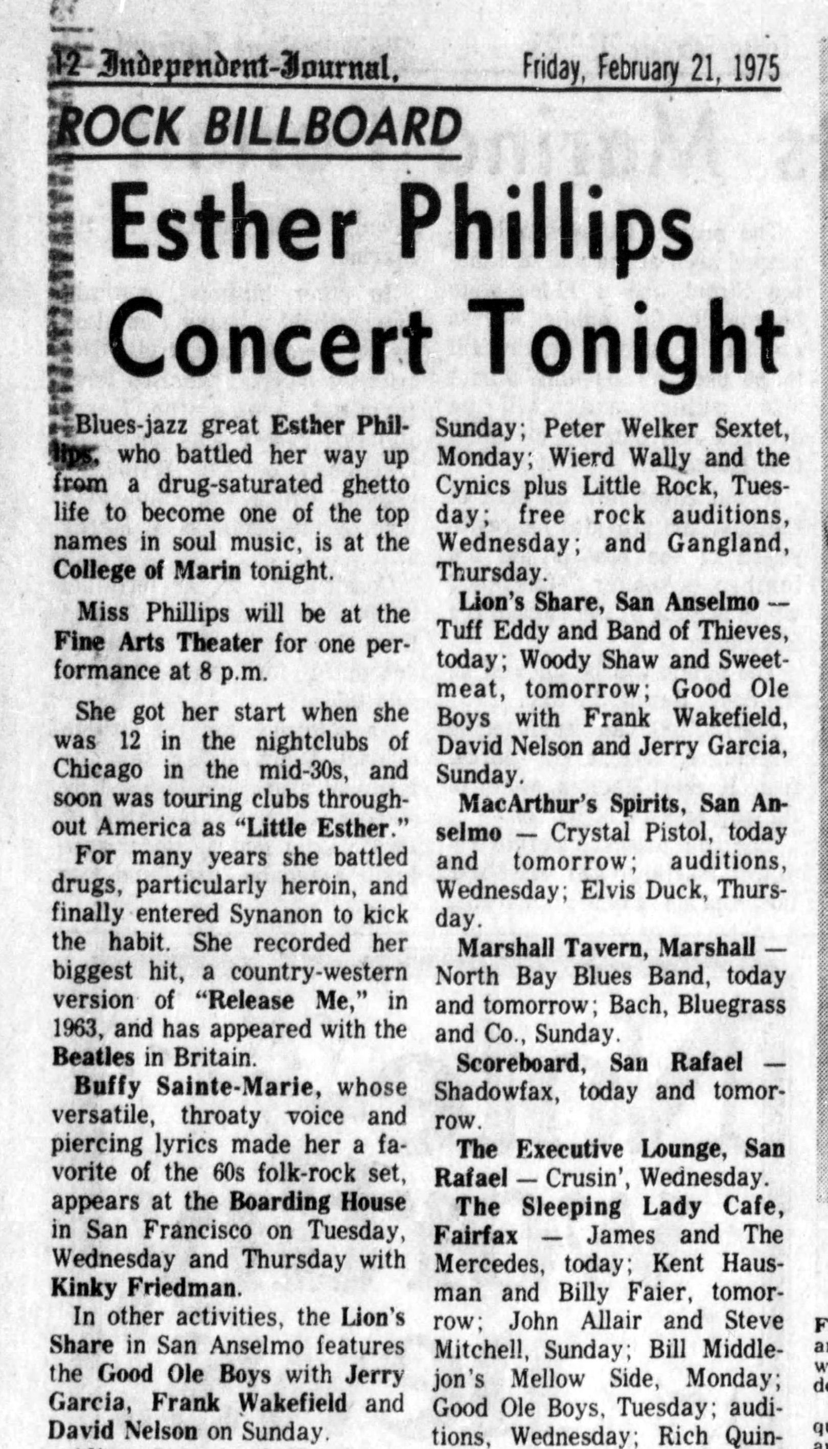 listing: "Rock Billboard: Esther Phillips Concert Tonight," Daily Independent Journal (San Rafael, CA), February 21, 1975, p. 12, billing "Good Ole Boys with Frank Wakefield, David Nelson, and Jerry Garcia".