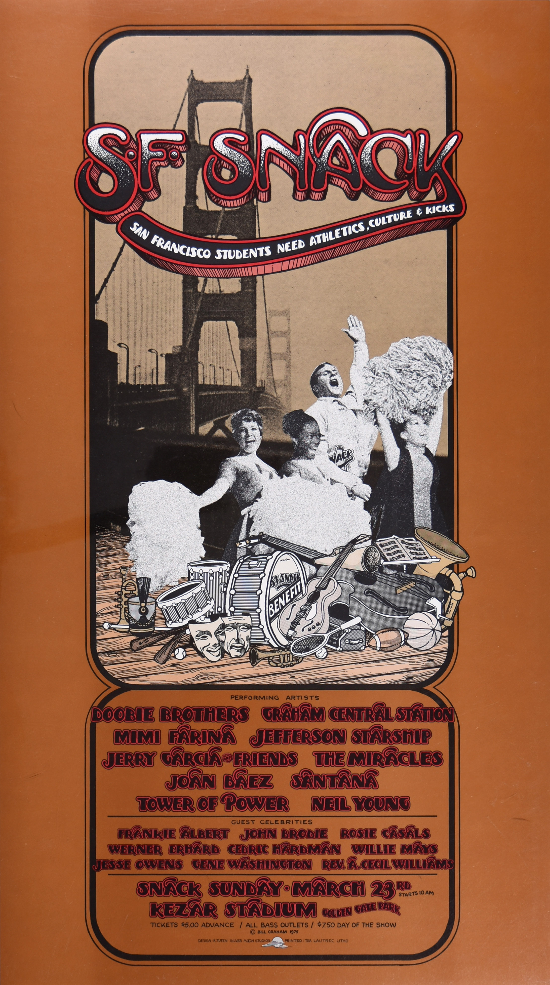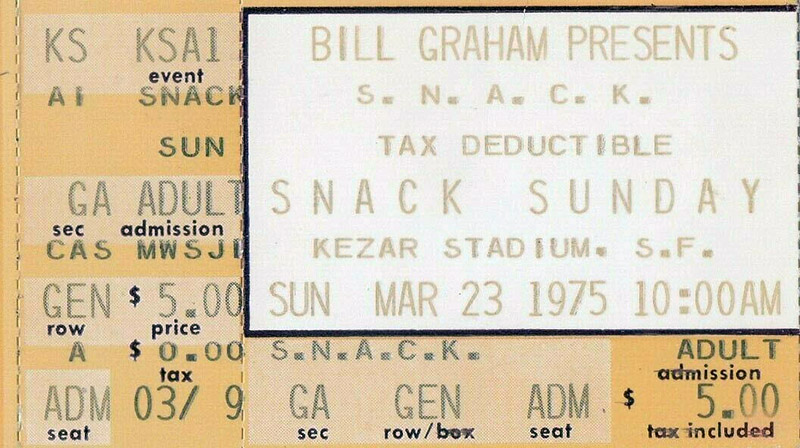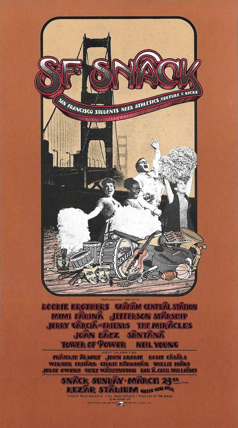 expost: Charles Perry, "Nine Hours of Peace, Love and Sports: Dylan, Brando and Co. Work for SNACK," Rolling Stone no. 186 (May 8, 1975): pp. 11-13, 15: "The reunited Dead came on to enthusiastic cheers. Their set was entirely taken. up with "Space Age," a long, nooding space shuffle written for the event." Graham calls it his own finest hour - raised $200k! See also John L. Wasserman, "They Did It For Graham," San Francisco Chronicle, March 26, 1975, p. 46 and "More on the World of Benefits," San Francisco Chronicle, August 18, 1975, p. 38.
