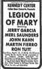 review: [negative] Helguera 1975: Not mentioned which show he attended, but he does mention one song, we attach to the early show. "Arriving … a mere 45 minutes late, the Legion began to laze out the notes of a banal, sluggish blues number." Garcia was "obviously a little over his head during the jazzier numbers". "For the most part, the Legion of Mary played listless, boring music, uninspired and uninspiring".