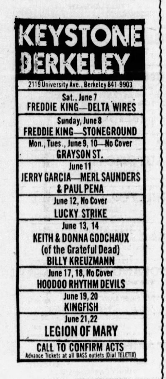 Sue: band takes $500 or 80% total gross door receipts. Contract names "Merl Saunders, Jerry Garcia & Friends". Tutt had finished Elvis tour in Memphis the night before and we have long guessed he didn't play this show (because they used JGMS rather than LOM band name). Then a fragment of evidence appeared: One of Rex Jackson and Betty Cantor-Jackson's Legion of Mary 7/6/75 reels was in this box, with scratched out notation reading "Merl & Jerry (Eddie - drums), 6/11/75 reel #4, 15ips 2 trk NM Nagra SL11183". We thought it might be Merl's cousin Eddie Moore and were dissuaded of that somehow. But now that we know he played 6/8/75, we are updating our priors to strong confidence that he played this night as well.
