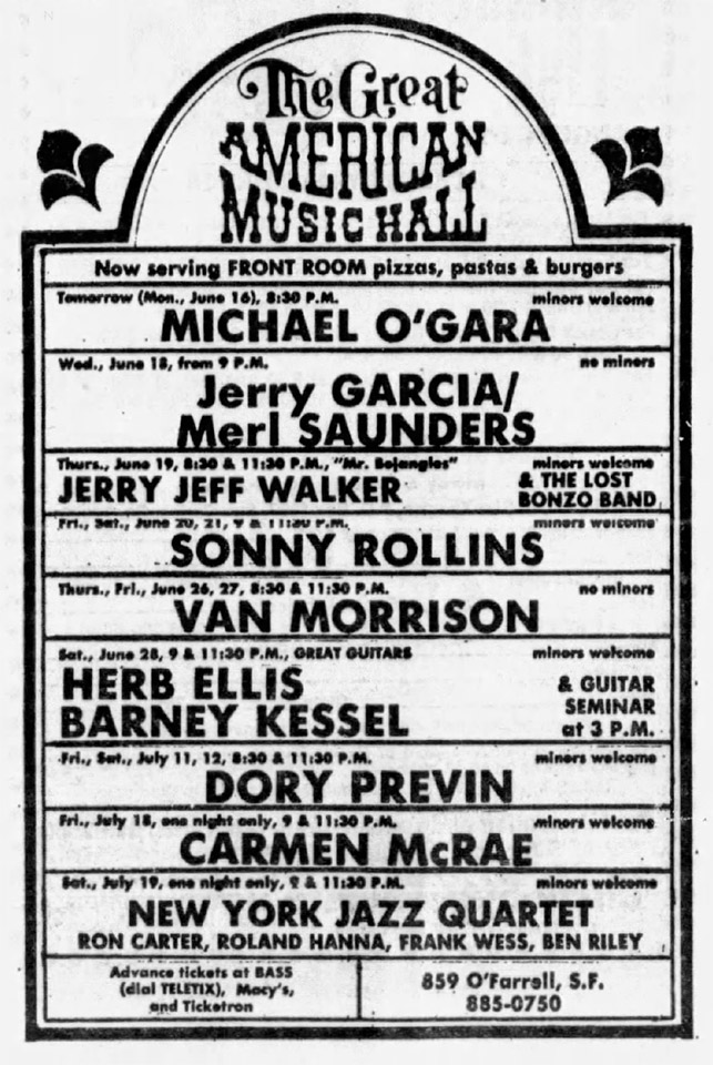 expost: Alexander 1975; Cash Box item reports this as "a super session with Jerry Garcia and Merle [sic] Saunders for a live recording of a Great American Music Hall gig".