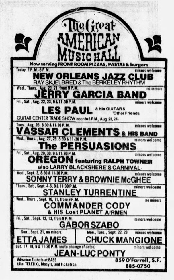 ads: [contra] San Francisco Sunday Examiner and Chronicle Datebook, August 10, 1975, p. 29 | [contra] San Francisco Sunday Examiner and Chronicle Datebook, August 17, 1975, p. 9, both billing "Jerry Garcia Band"