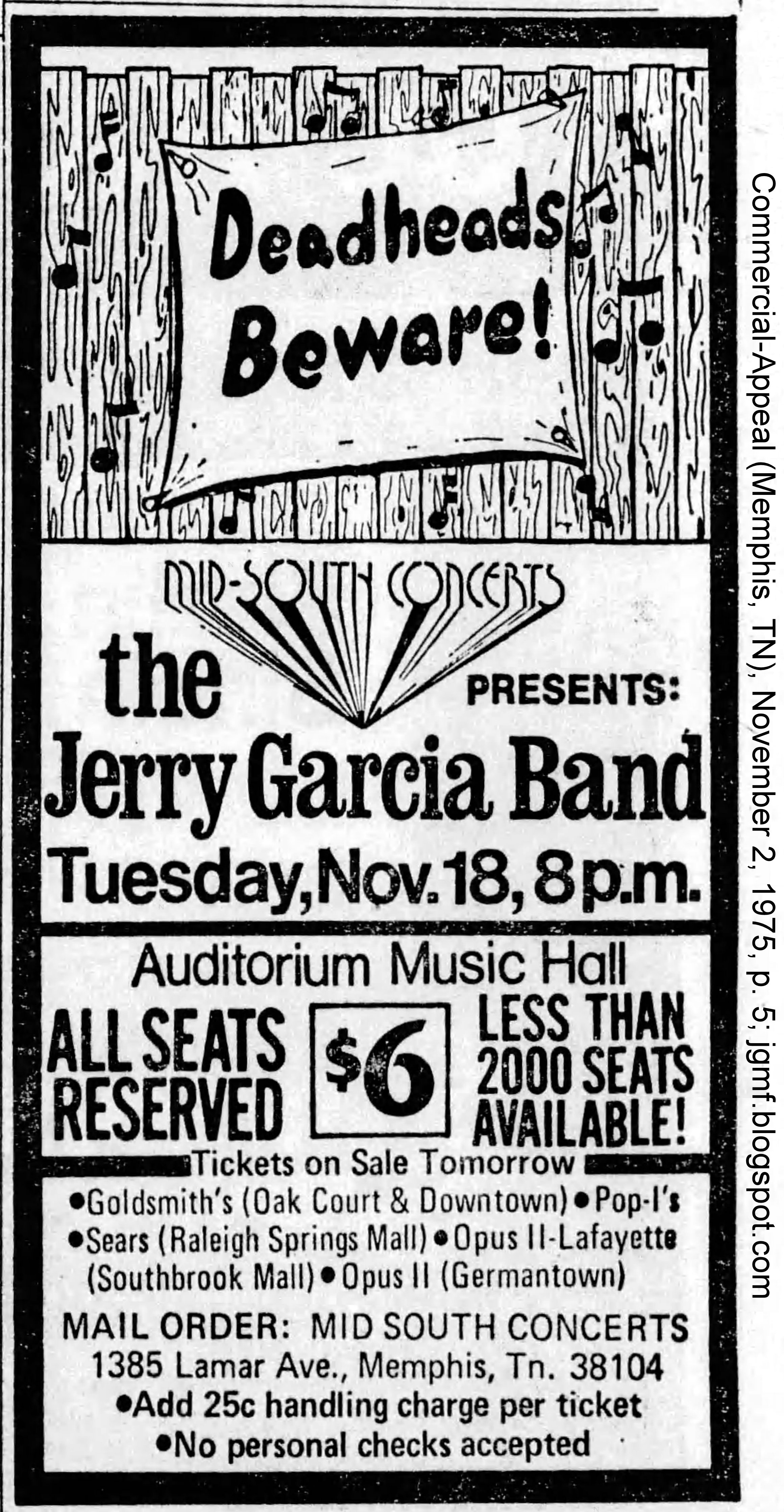 JGB at the Auditorium Music Hall, Memphis, TN, November 18, 1975 (CXL)