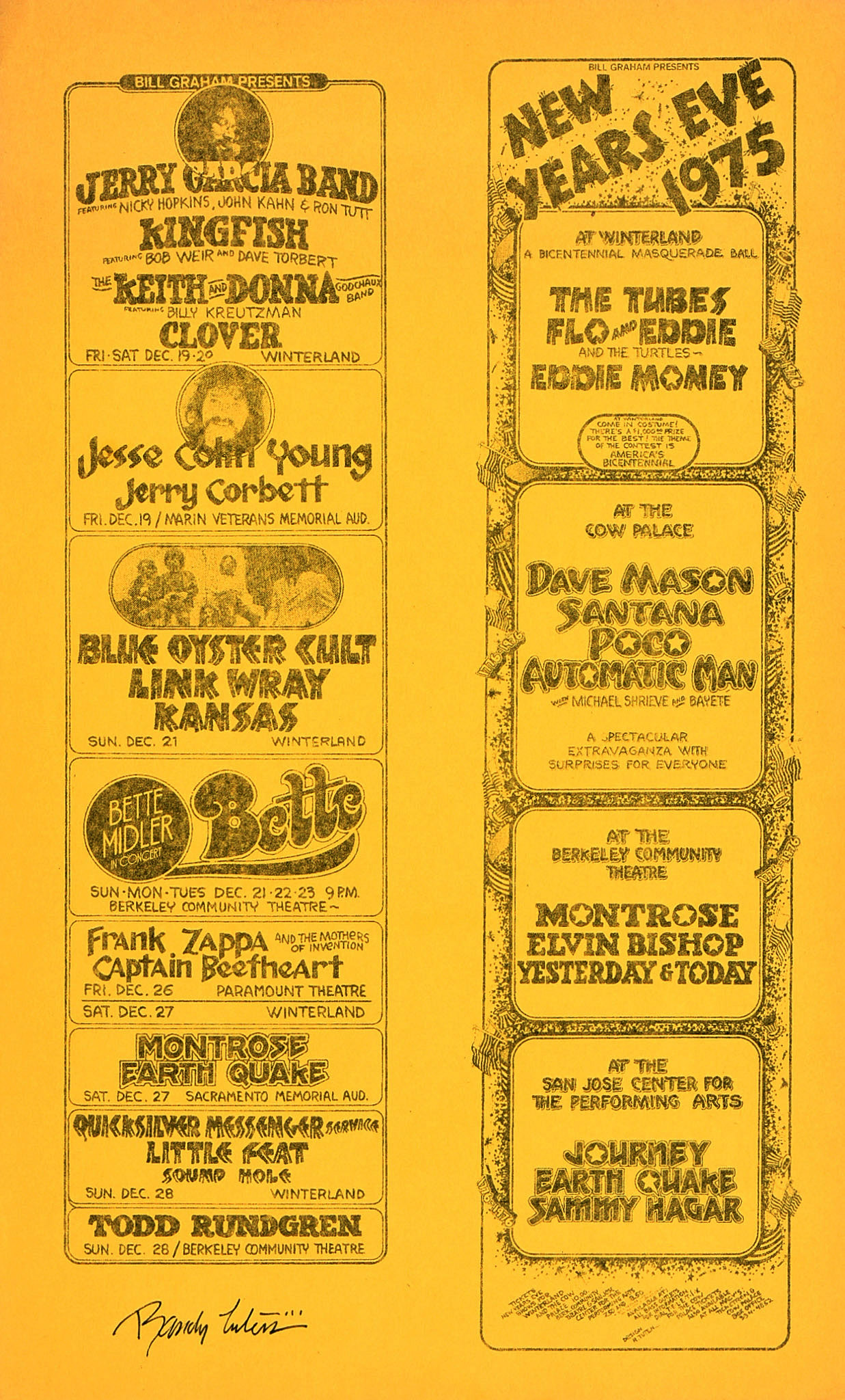 Greg Gaar lists these photos as being from 1975-06-17, but our friend Volkmar has pointed out that Garcia played the Wolf at that show. And they would not be from 1975-12-19 as other photos from the 19th show Bobby in a plaid shirt (Greg's set shows him in a solid colored shirt). So we assume they are from this gig.