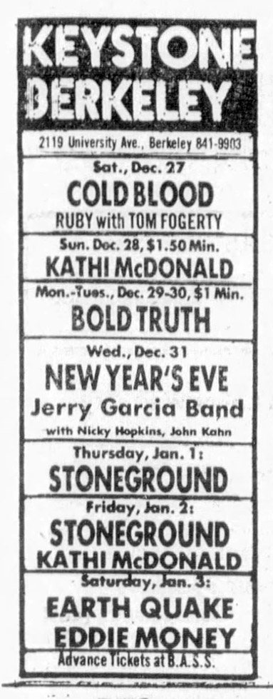 ads: San Francisco Sunday Examiner and Chronicle Datebook, December 14, 1975, p. 43 (billing New Year's Eve: Jerry Garcia, Nicky Hopkins & John Kahn) |San Francisco Sunday Examiner and Chronicle Datebook, December 21, 1975, p. 43 (billing "New Year's Eve: Jerry Garcia Band with Nicky Hopkins, John Kahn") |San Francisco Sunday Examiner and Chronicle Datebook, December 28, 1975, p. 41