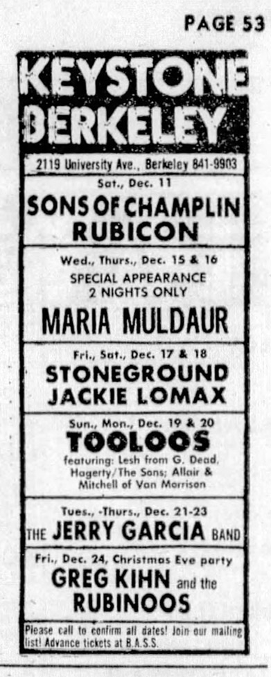 review: [positive] Kelp 1976. Love his expression "sway music". He namechecks John Rich. He mentions STOF and KOHD. Note that (1) STOF is not known to have been played this night, but (2) his article appeared on 12/22, so much be reporting on the 12/21 show. Maybe the band told him they were playing "STOF".