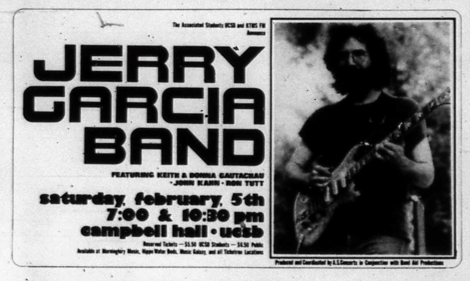 Proceeds to go to Red Wind Foundation. Grandfather Semu Huate was founder of benficiary, still directing at this time: "Red Wind Foundation and inter-tribal and inter-racial community on 160 acres near San Luis Obispo California, a non-profit organization dedicated to preserving the cultural and religious heritage of the Chumash and other American Indians." The ad makes no mention of a benefit, it's your standard campus event ad. The Mayem exante says the show was only approved on 1/19, and does mention the Indian angle. The picture caption from the day of the show identifies "Jerry Garcia of the Grateful Dead" - I had seen this on an earlier SB show and thought it odd, and I still think it odd here.