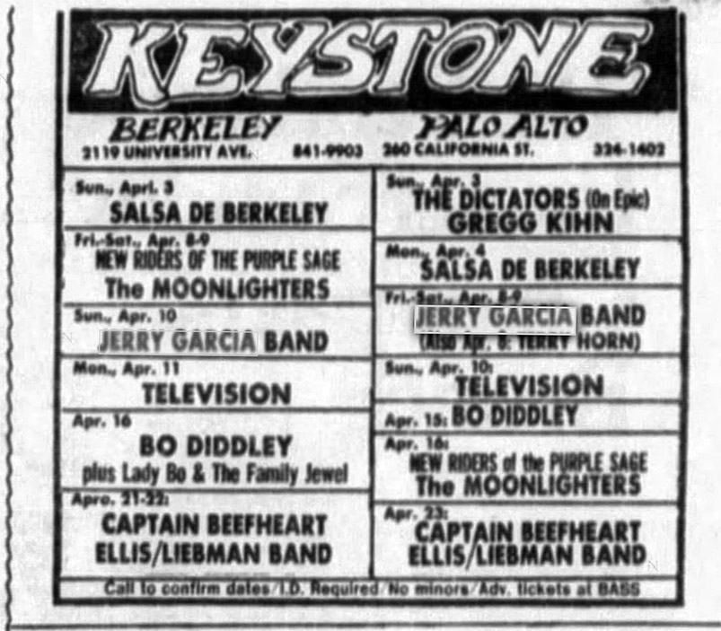 Slowly Unraveled Over You: JGB 3c at Keystone Palo Alto, April 9, 1977