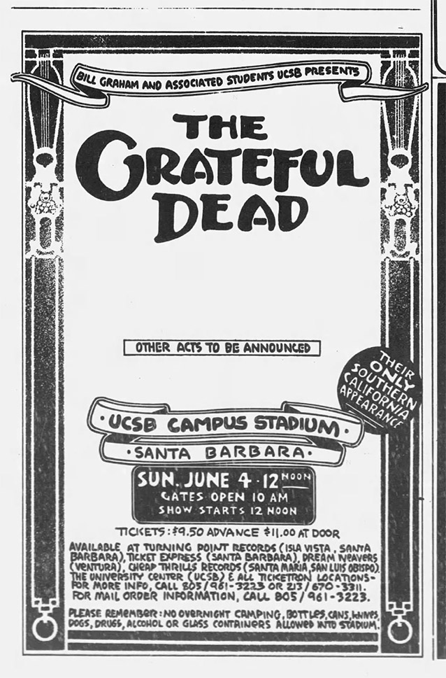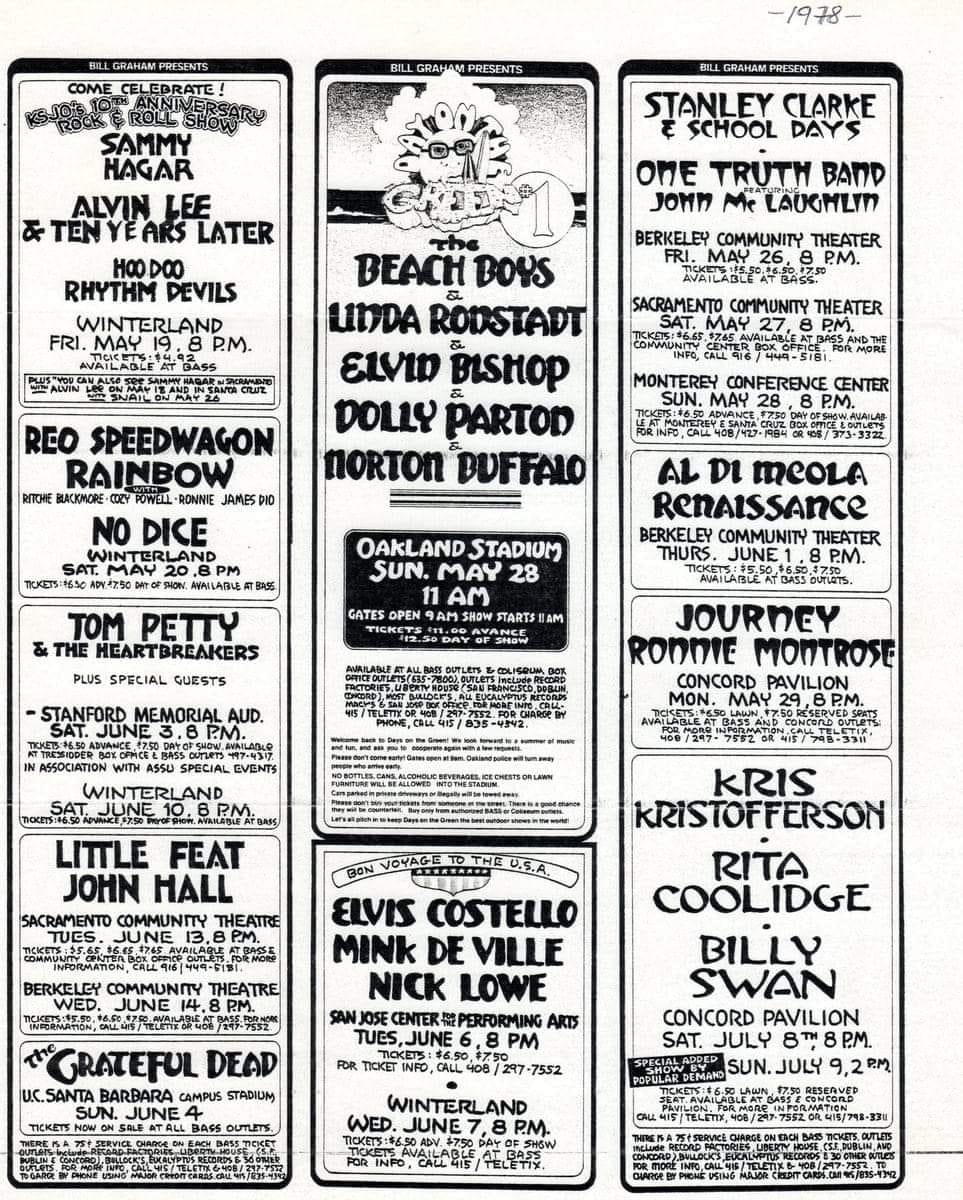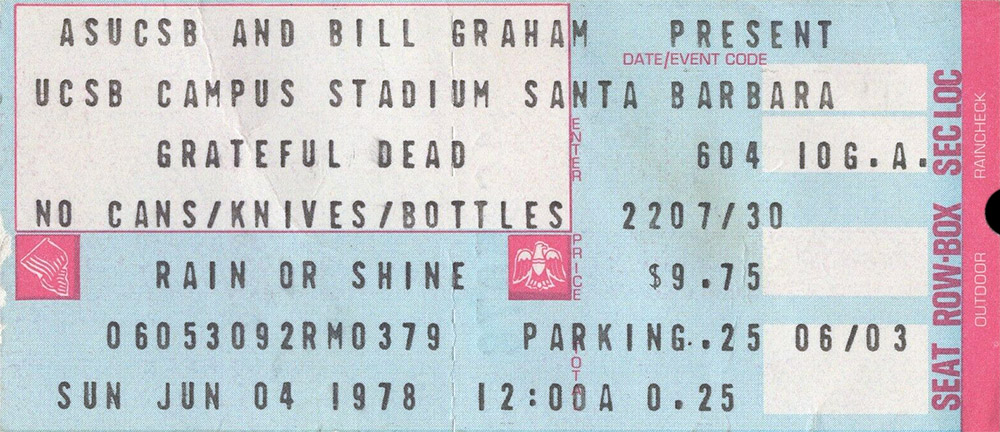 Attendee peetstr50 recollections of the openers... "The lineup that day at the UCSB football stadium was to be first a local reggae rock band I believe they were called Waa Koo and they were quite good, followed by Warren Zevon, then the Elvin Bishop Group and then the Grateful Dead. But after the local band played there was a little bit of a wait followed by Elvin Bishop, NOT Warren Zevon. (?) Then after Elvin Bishop put on a down-home kickass performance Elvin says "Stick around, were gonna have a little jam session with Jerry Garcia and the local boys." Members of Waa Koo, the Elvin Bishop Group and Jerry Garcia played for about 30-40 minutes. Lots of fun! But then there was a kinda long wait. And Warren Zevon's band took the stage. Then Warren came out and he was VERY very drunk. And he proceeded to be abusive and disrespectful to the audience. And now you know why Warren Zevon was booed off the stage at the UCSB football stadium back in June 1978, sorry to say."