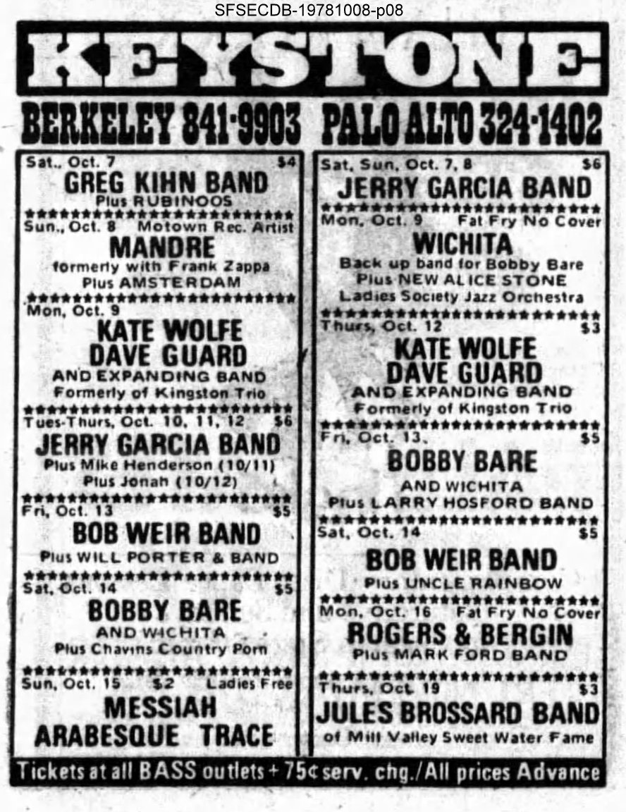 We cannot confirm the partial set I we list here. Traditional Deadbase list (Scott et al., 2015, 411) was said to be from first set, and included "I'll Be With Thee," "All By Myself," "Green Onions," and "Harder They Come". We can now place IBWT and HTC in set II. We retain the other two songs as being from set I, but can't confirm. Jim Powell attended a JGB show in autumn 1978 at Keystone Berkeley with Will Scarlett and recalls "All By Myself", which we attach to this date. Jim Powell has confirmed that the Deadbase setlist did not come from him.