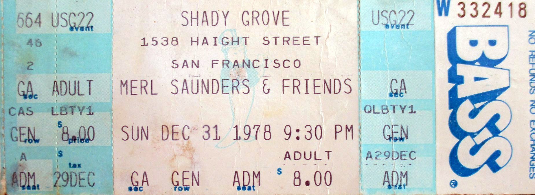 As remarkable and improbable as this event seems to be --Garcia dropping into a bar on Haight Street on New Year's Eve '78-'79, before heading over to close Winterland in a play-'til-dawn extravaganza with the Dead-- it very much seems to have happened. David Kramer-Smyth deserves the finder's fee, posting about this in a comment at Nick's deadthinking blog, based on DKS's conversations with one of the partners in the Shady Grove. Garcia only played the first set of this gig, then made the short jump over to Winterland to join the goings-on there. Merl Saunders, Jr. has subsequently confirmed to IFJGS researchers that this gig took place. Wow.