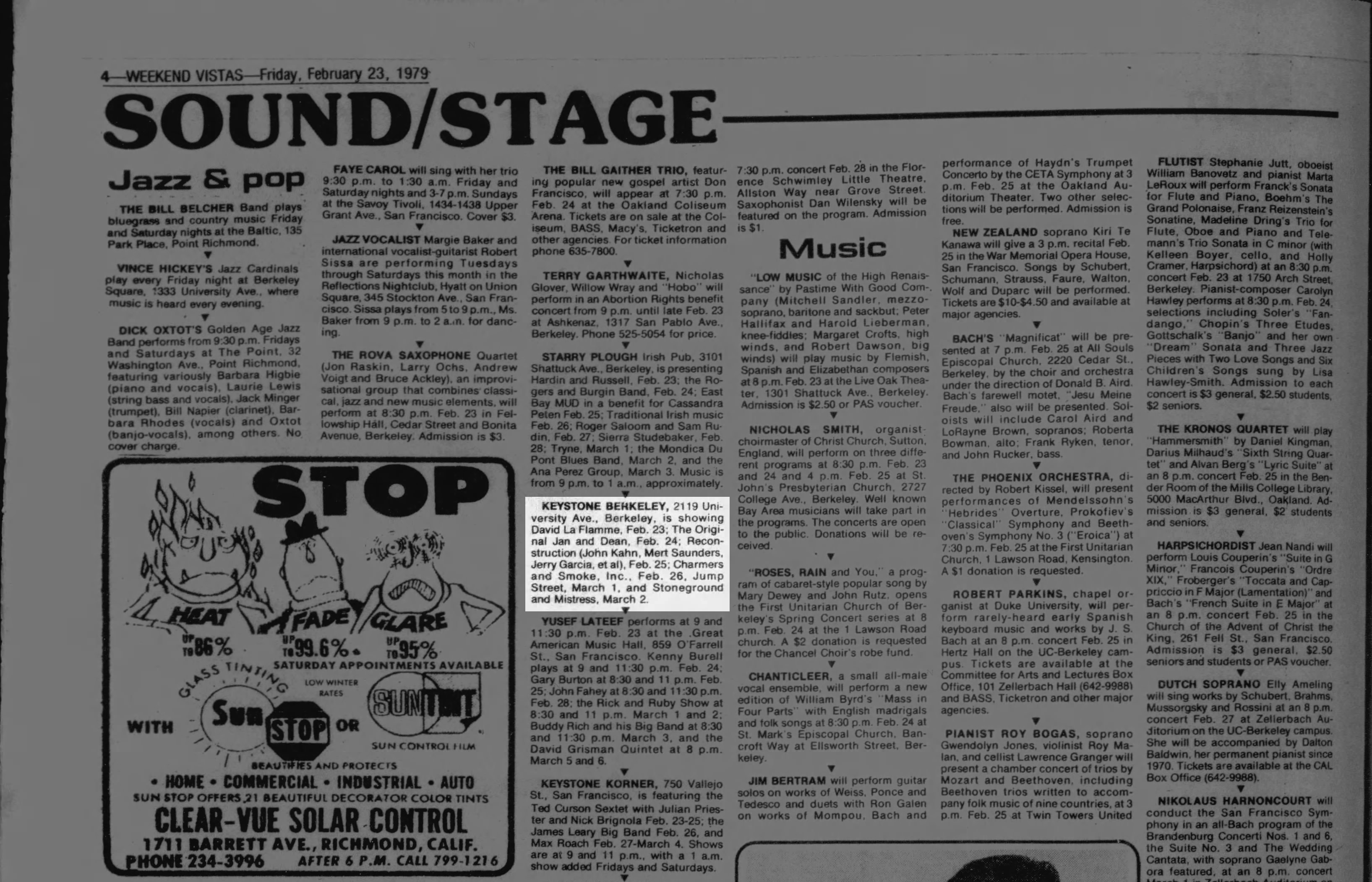 listing: North East Bay Independent and Gazette, Weekend Vistas, February 23, 1979, p. 4