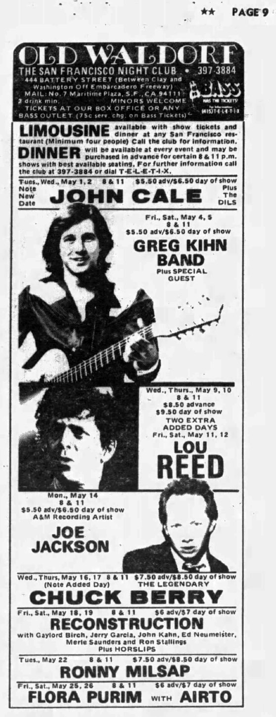 lostlivedead: May 19, 1979: The Old Waldorf, San Francisco, CA: Reconstruction/Horslips. Corry: "(May 18) Horslips had played a short half hour set at 8:00pm, the standard arrangement at the Old Waldorf, and then Garcia's group had not come until nearly eleven. Reconstruction then played so long that there was no time for Horslip's late set."