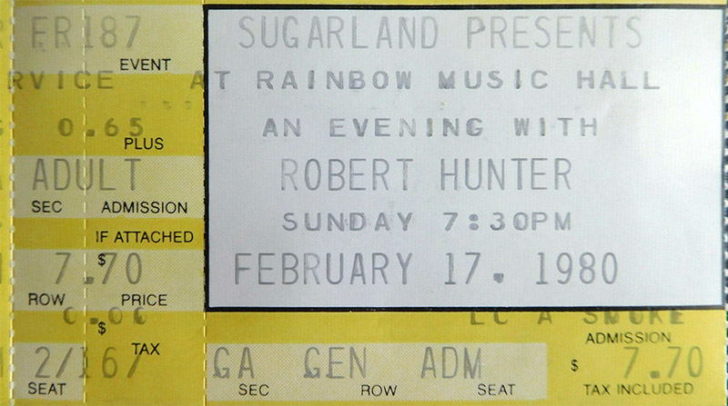 Rachel Sweet billed to open, but "announced the cancellation of her tour last week, much to the delight of Garcia fans" (Fausner). A ticket from ebay shows "Special Guest The Tom Johnson Band". Instead, Robert Hunter canceled a gig at Rainbow Music Hall in Denver, so he could open for JGB, joining the tour on this night.