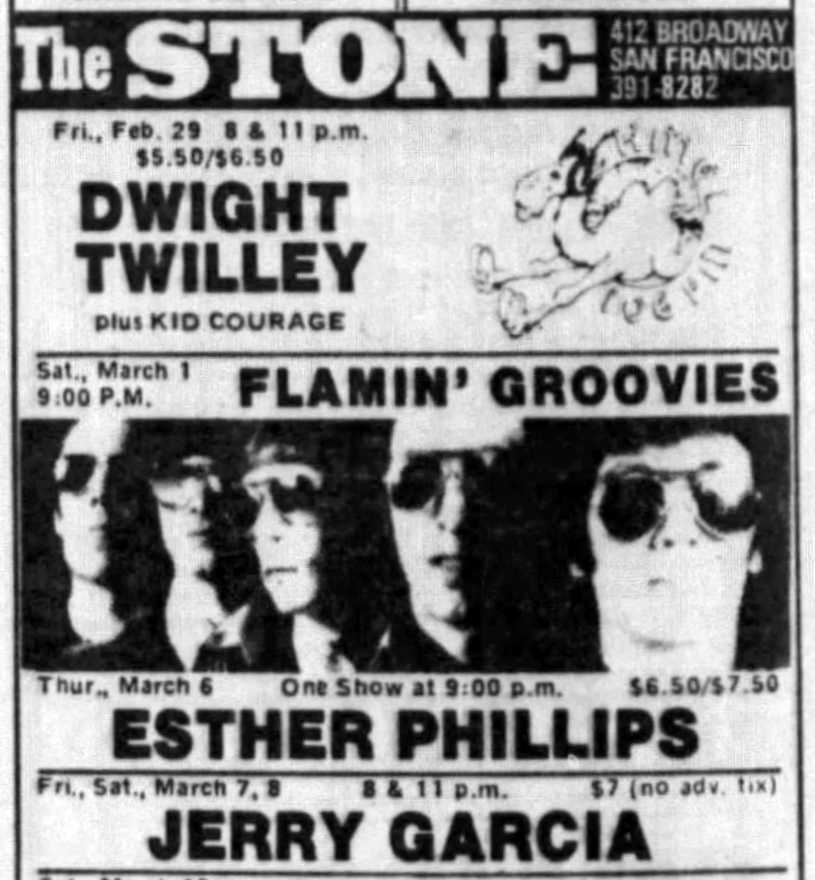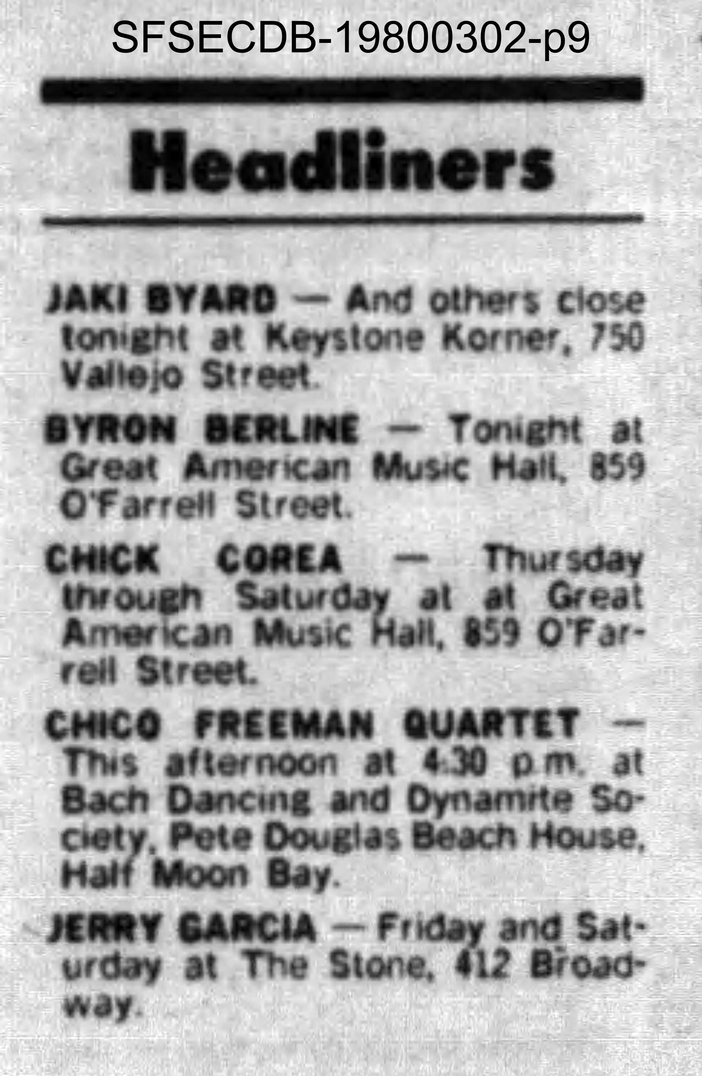listings: San Francisco Sunday Examiner and Chronicle Datebook, March 2, 1980, p. 9 |Foghorn, March 8, 1980, p. 13