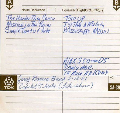 An attendee, in private correspondence: "No need to sugarcoat it, we all know the score -- that they'd rock through an early show, but by the time the late show came around Garcia and Kahn would be somewhat incapacitated ... This show, 11pm start time, ended at 3:45 in the morning. Basically it went down like this: Dr. John plays a longer set than in the early show (perhaps because Garcia was in no condition to play?), a very long break ensues and eventually JGB takes the stage and sleepwalks through four tunes. Abruptly, Garcia walks off stage after Tore Up prompting a cascade of boos from the crowd - I think about the only time I ever heard Garcia get booed. After several minutes John Scher comes out and announces Garcia is just taking a short break. It wasn't short. Finally, 2:45 am-ish, Garcia returns and manages to play for an hour." Monarch was slapped with a $500 fine for curfew violation.