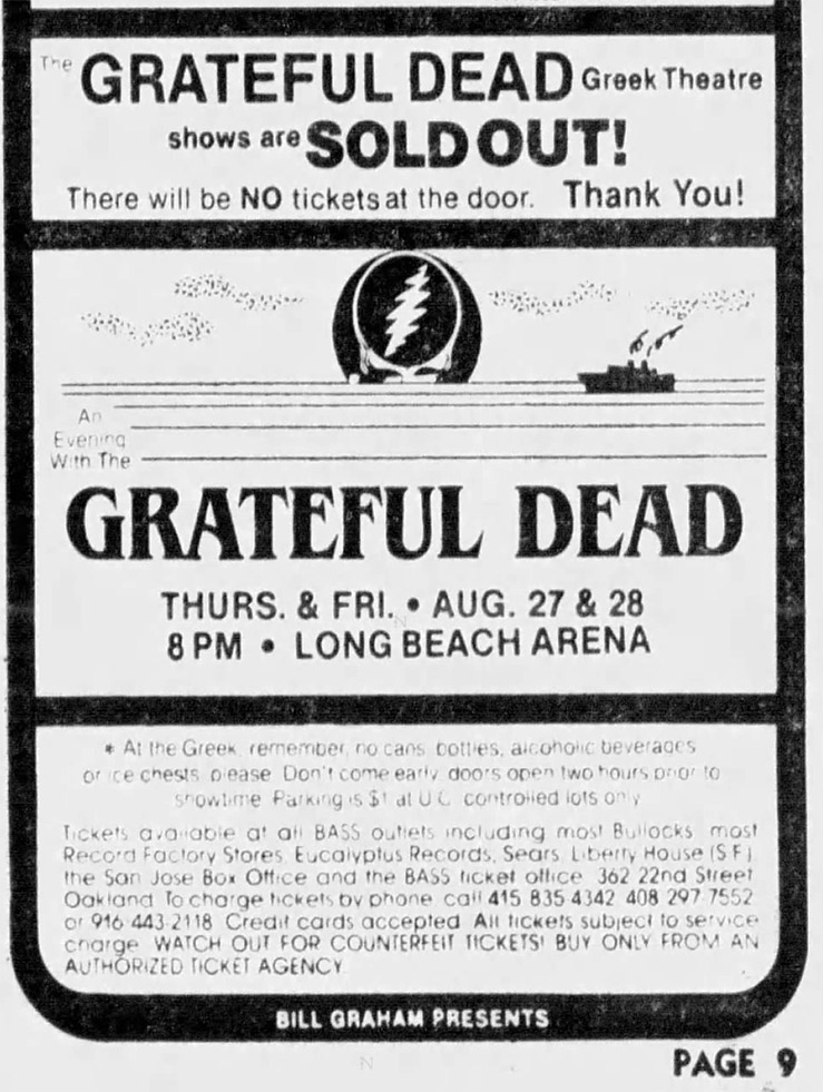 review: Larry Kelley, "Fans Grateful for the Dead ..." San Pedro News Pilot, August 29, 1981, p. 10. He notes the presence of Flora Purim and Michael Hinton during the rhythm devils section. Thanks to Jesse Jarnow for the tip.