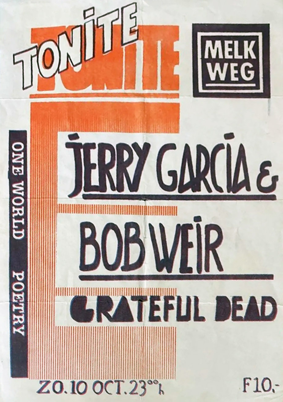 McNally (2002, 543): "When a gig in France was canceled, [Rock Scully] arranged for Jerry and Bobby to play an acoustic show at the Melk Weg club in Amsterdam, a four-hundred-seat room that had among its features the Market, which sold comic books, candy, and various kinds of hashish."