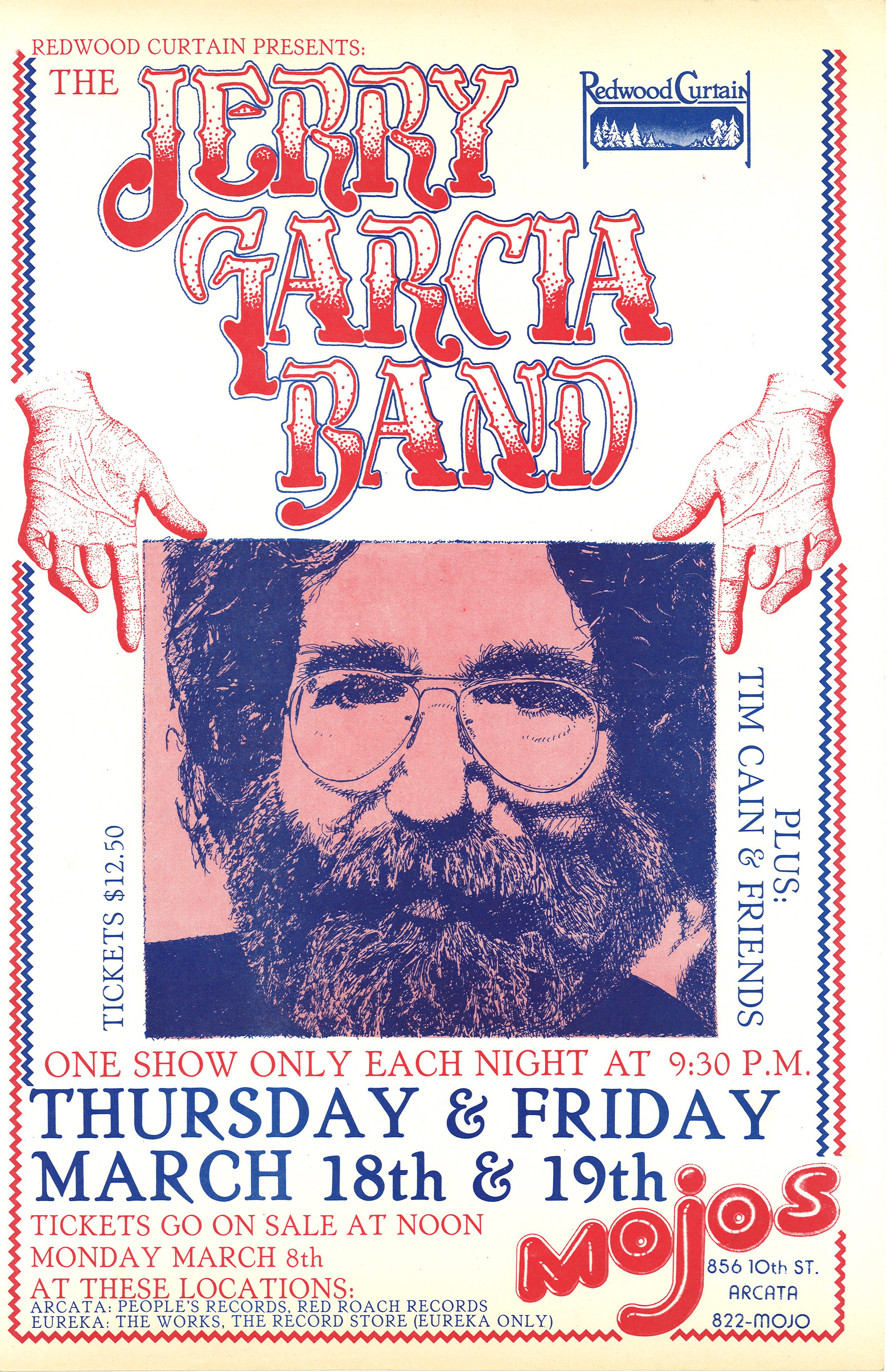preview: "Garcia ticket sales planned," Times-Standard (Arcata, CA), March 4, 1982, p. A-4: "The long lines which repeatedly form days before Grateful Dead concert tickets go on sale are expected to form when tickets for two local Jerry Garcia shows hit the outlets. Garcia, leader of the Grateful Dead, will perform two shows at Mojo's ..." Expected to be sold out.