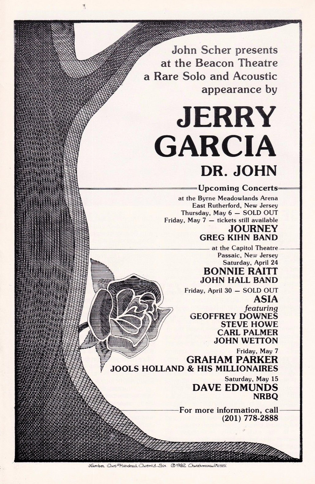 ref: Roman Kozak, "John Scher Moves East of Hudson," Billboard, April 24, 1982, p. 44; Kozak notes that this ends the de fact arrangement whereby Scher stayed West of the Hudson and Ron Delsener owned NYC. This was a big move for John Scher, and it's not surprising that Jerry would help him make it - they were very close, and their careers advanced together. See JGMF, Jerry Garcia and John Scher.