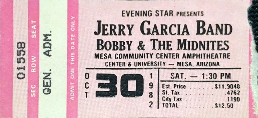 John Scher promoted. $20k guarantee for the two bands, money split even-steven but Bobby and the Midnites to receive 100% top billing. JGBP lists capacity as 4,950, but Billboard showed 3,800 for this gig. Gross potential was $47,500, which 5% tax dropped to NGP of $45,238.10. Beyond guarantee, JGB would get 39% of gross gate receipts after tax over $42,414, plus 50% of the difference between estimated non-variable expenses of $33,315 and actual expenses.