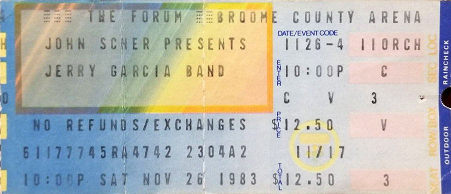 NB two sets, second set a mini. etreedb.commenter Dave (at shnid-20657) reports "Truth be told there was a setbreak in the late show and not an encore. ... After about a 45 minute break Jerry returned to a half full theatre for three tunes and bolted. Great time, great fun, cold night and the boys were ripped by the night's end. Setbreak must have been hardcore. Leaning on the rail for the last three songs some tripster kept making sexual gestures to one of the Jerryettes, and Garcia never opened his eyes to see it. Crowd was ripped too. Great theater!" (11/23/2003).