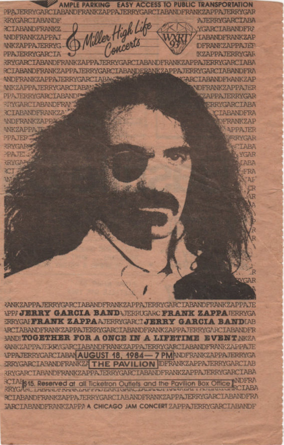 review: [positive] Van Matre 1984: says the opening / closing slots were determined by a coin flip, with Zappa headlining. [He got the ad imagery before the fact, too.] Van Matre likes both of the "aggressively unfashionable" acts, finding Garcia "capable of conjuring up a kind of sweet, stoned, meandering magic with his music that has lasting appeal".