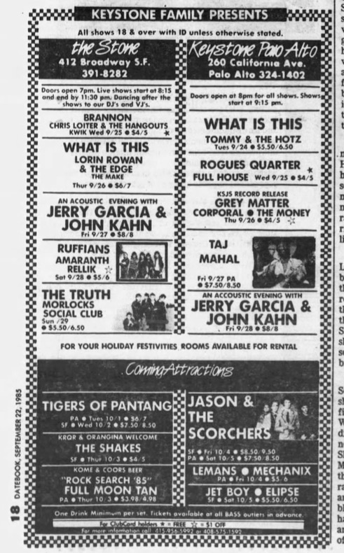 ad: San Francisco Examiner Datebook, September 22, 1985, p. 18;