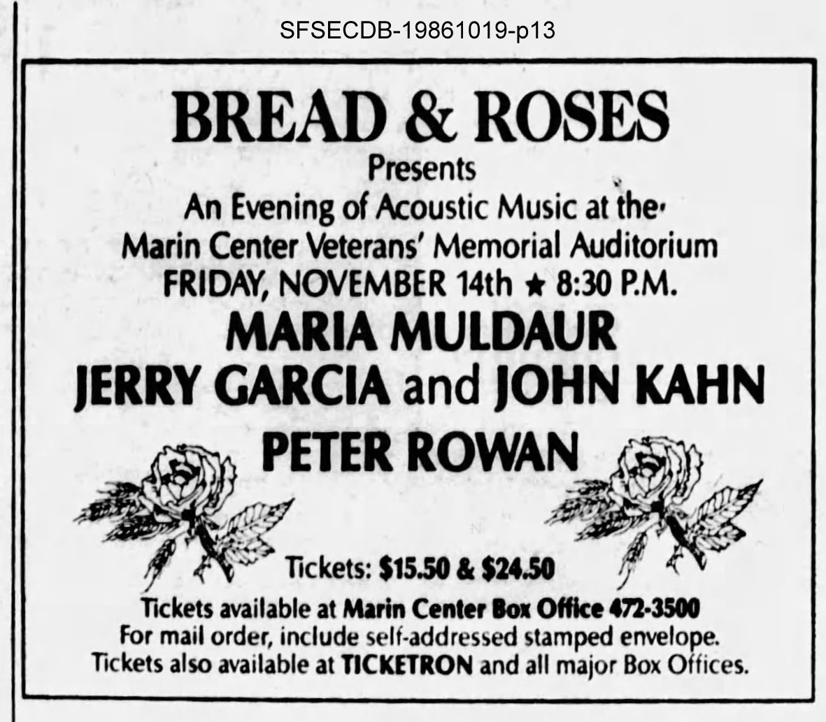preview: "Benefit concert for Bread and Roses," Argus-Courier (Petaluma, CA), November 14, 1986, p. 1B.