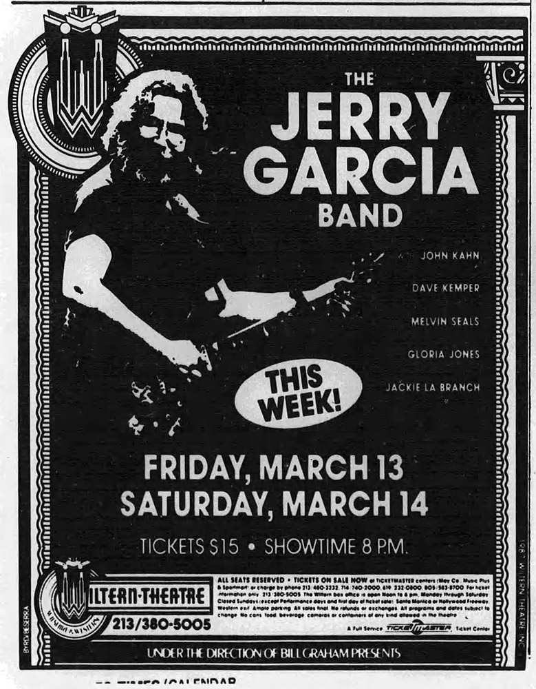 review: [positive] Enry 1987: focuses on the hippy throwback theme, but includes adjectives poignant, elegiac, faintly sorrowful; "Vibe was not sullen … but vulnerable, healing, serene." Listening to JGB, "one doesn't get off on images and pose, but on the endless invitation to a voyage, to letting go, grooving on the waves of [Garcia's] sound." | [positive] Paul 19870316, descriptions like "fully recovered," "warm," ,"healthy," "trimmer," with greater vigor and intensity than the prior year at the Wiltern.