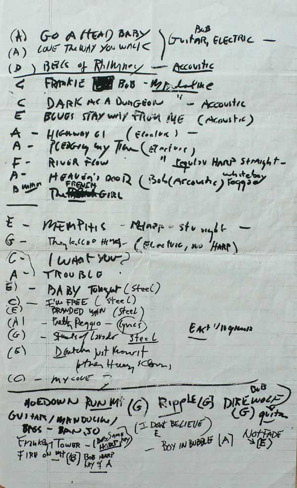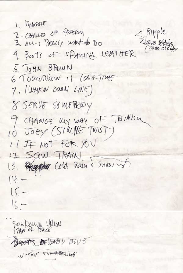 Placeholder entry for the Dylan / Dead rehearsals. Some songs were played multiple times, but we only list each once. "Dylan and the Dead spent three weeks in May at Front Street, rehearsing upwards of one hundred songs" (McNally 2002, 563). Zimmy writes about these sessions in Chronicle, and his recollections are presently excerpted here.