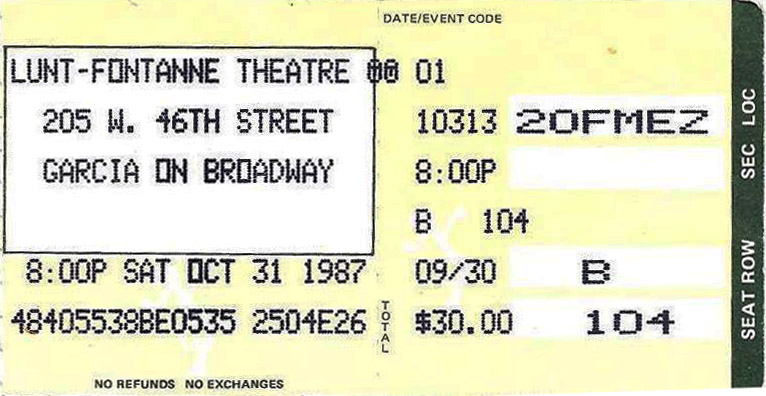 Regarding Garcia on Broadway personnel, we have not pinned down nights when Kenny Kosek (fiddle) played w JGB, though we know he was not present for 10/28/87a.