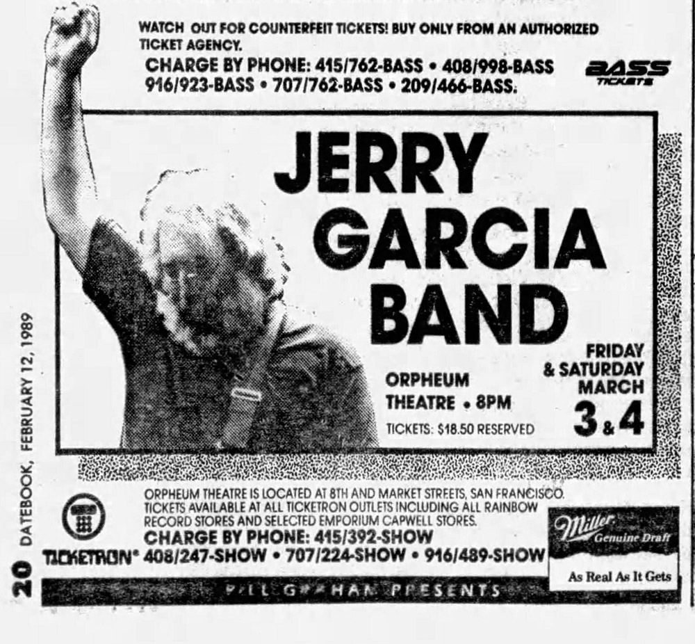 JERRY GARCIA BAND 3-3-1989 ORPHEUM THEATRE SAN FRANCISCO CA