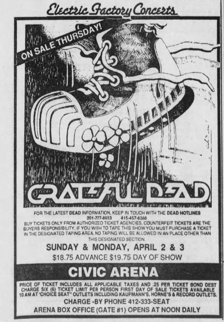 From jaybrug on dead.net: This whole Pittsburgh scene was total chaos. Wasn't long after this that they stopped letting us camp on site. The village was huge here, penetrating into the surrounding neighborhoods (the infamous Hill District). Deadheads owned the city, way more people showed up than "The Igloo" could accommodate. Redneck cops, actually taunting us like some high school bully, rainy weather and an ignorant Sophie Masloff referring to us as "Dead Enders" couldn't break our spirits.