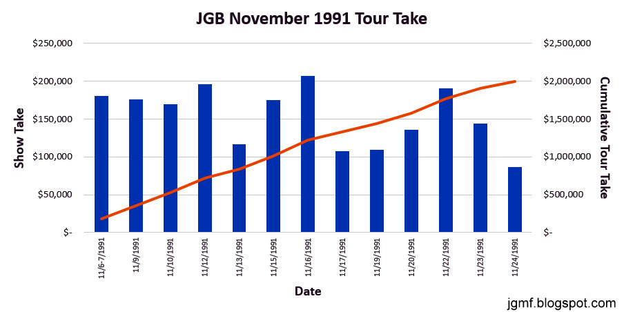 Sue: capacity before comps/kills of 15,985 @ $22.50, 3,180 @ $20. $60,000 guarantee vs. 85% of net receipts after agreed expenses, on gross potential of $423,262.50. Production costs $17,500. Ol Jer's bar band took home over $175k this night - I've a feeling we're no longer in the Keystone!