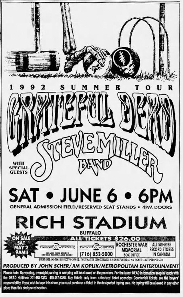 By this time, counterfeiting had become such a problem that GD ticketing maestro Steve Marcus had to hit the road to run on-site verifications, and what he saw in Buffalo horrified him, "a large group heading in his direction 'like a pack of wild animals' ... after running around the parking lot, they made straight for one of the entry gates, smashing it open", security urgently instructing Marcus to "get your table and get the hell inside" (Browne 2015b, 403).